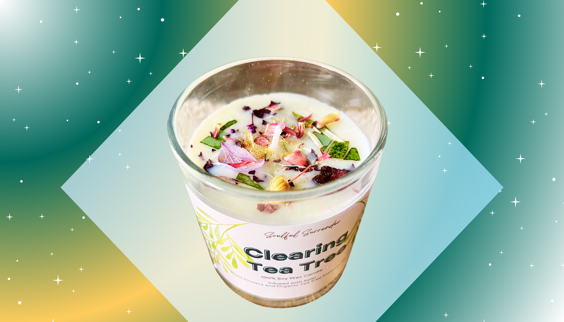 Enjoy the clearing scent of tea tree essential oils with a slow-burning 100% soy wax candle, infused with dried flowers for an added mind and body boost. Light this candle when your environment is in need of refreshing and restoring. Tea Tree holds natural antibacterial properties, often used to help prevent the spread of germs in homes and offices. Tea tree oil is also a natural deodorizer. Its vapors do not mask, but instead break down musty or organic malodors, as well as smoke.