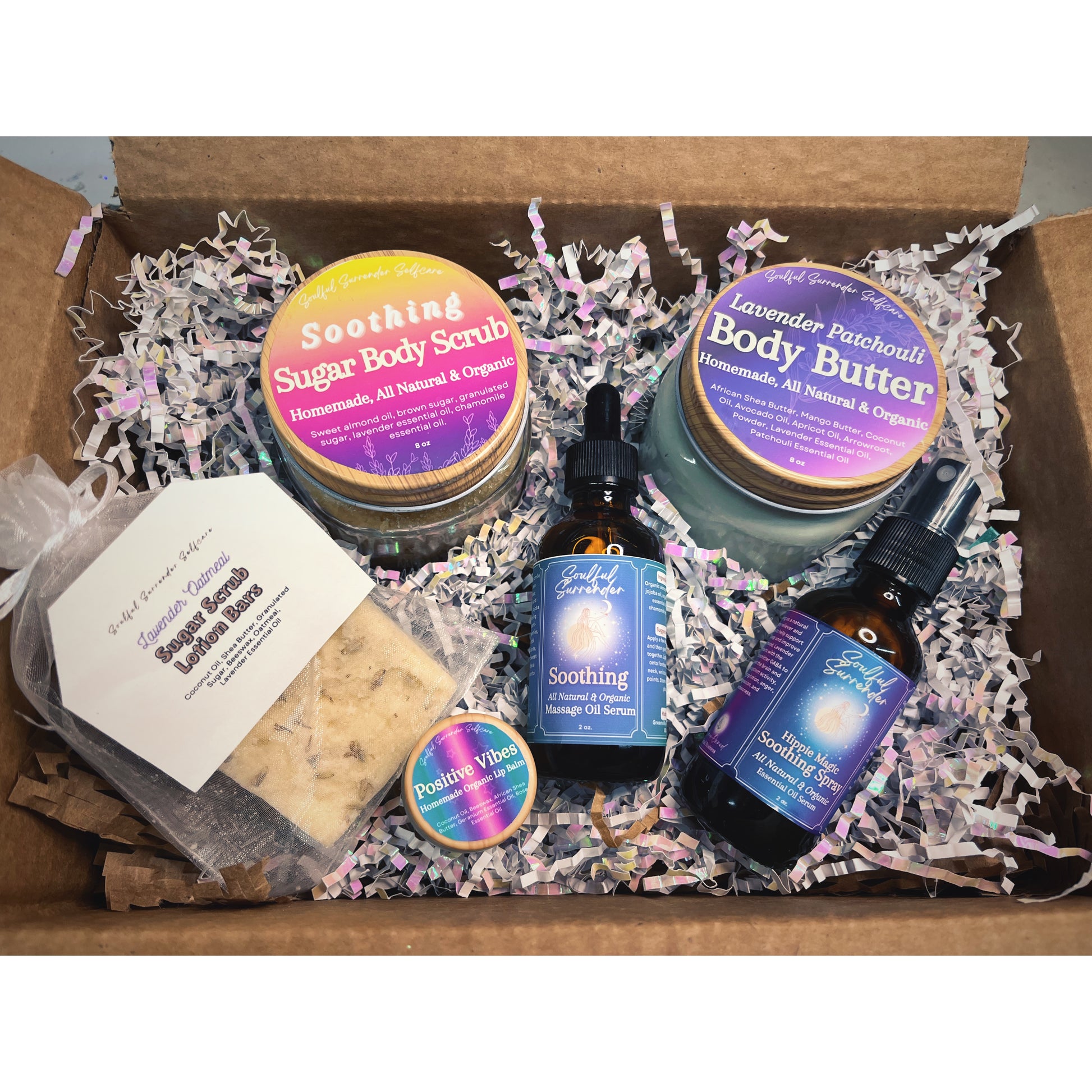 Complete your ritual with our Positive Vibes Lip Balm for soft, nourished lips and a Sugar Scrub Lotion Bar infused with Oatmeal and Dried Lavender, combining gentle exfoliation with lasting moisture.